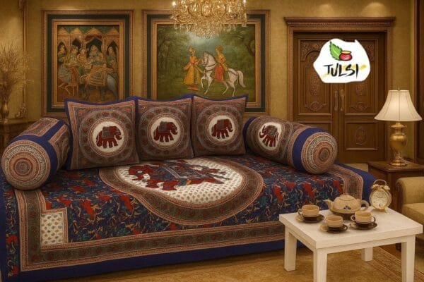Enhance your living room with this premium 6-piece Jaipuri Diwan Set, crafted from pure cotton. Designed with traditional elegance and comfort, it includes a bedsheet, booster covers, and cushion covers – perfect for stylish home décor.