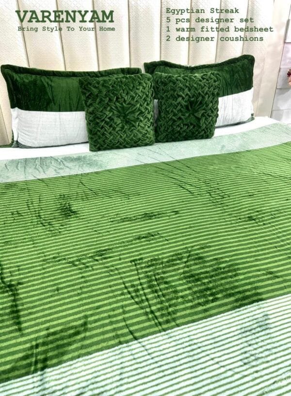 Egyptian Streak 5 Pc Designer Cushion & Bedsheet Set | Warm Flannel Fabric | Premium King Size Bedding Collection