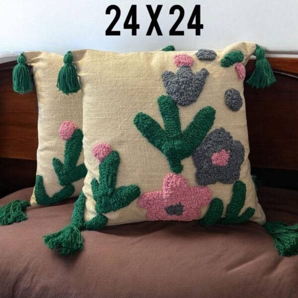 Elegant 24×24” hand-embroidered cushion covers crafted from premium cotton fabric — perfect for elevating any space.