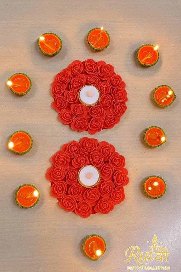 Elevate your festive décor with the Red Rose Tealight Plate Set. Crafted with premium foam roses on an MDF wood base and golden metal tealight stand, this set of 2 comes with LED tealights for a safe, elegant glow. Perfect for Diwali, weddings, puja décor, and gifting.