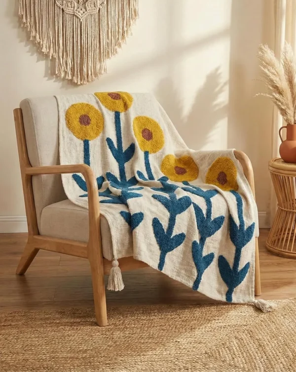 Hand Tufted Cotton Throw Blanket With a size of 50 × 60 inches, this throw blanket is perfect for layering over sofas, beds, armchairs, or lounge chairs, instantly creating a warm and inviting ambiance. Its 1.2 kg weight provides a balanced feel—light enough for easy use yet cozy enough for relaxing evenings.