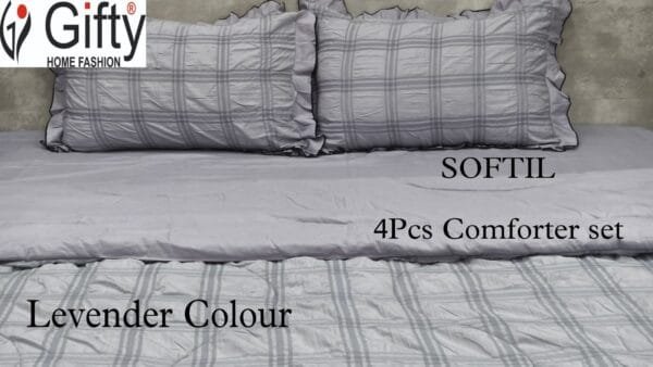 Experience luxurious comfort with the SOFTIL 4 PCS King Size Comforter Set featuring mercerised peached polycotton fabric, microfibre filling, and elegant frilled design.
